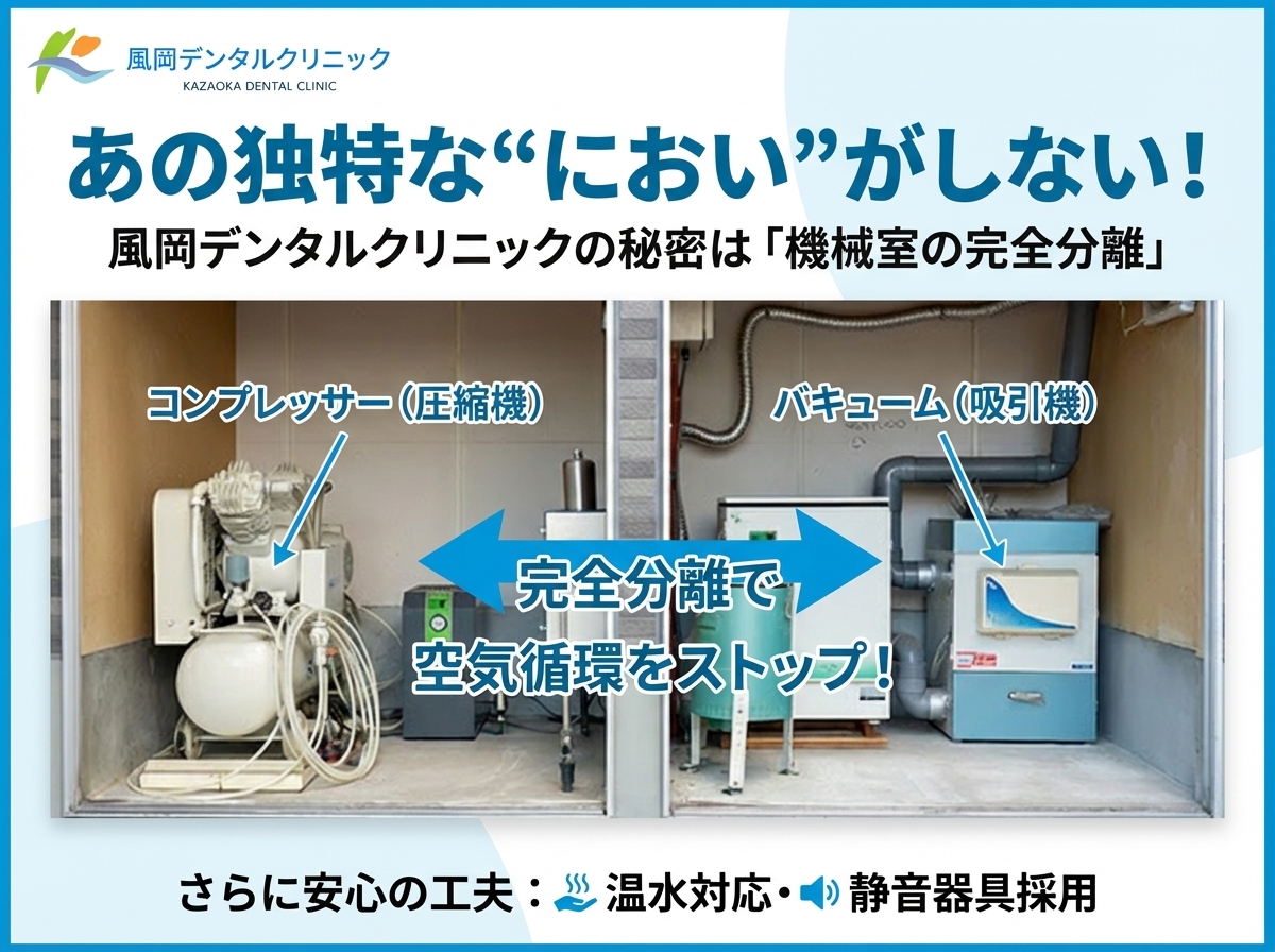 当院では、歯科医院特有の匂いを感じることがほとんどありません。バキューム室とコンプレッサー室を分離した設計により、治療中に発生する空気が院内で循環しません。高性能な空気清浄機に頼るだけでなく、院内の心臓部から清潔さを追求しています。